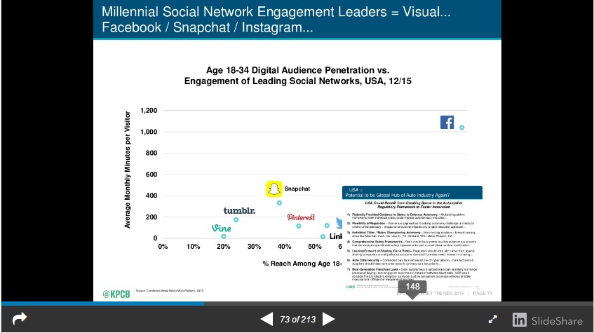 There is a wide range of opinions as to why companies like Twitter and LinkedIn haven’t been able to grow their user bases on the same scale as their counterparts Instagram and Snapchat. Here, Meeker taps into what may be a simple but important reason: imagery.