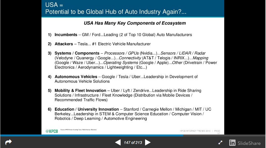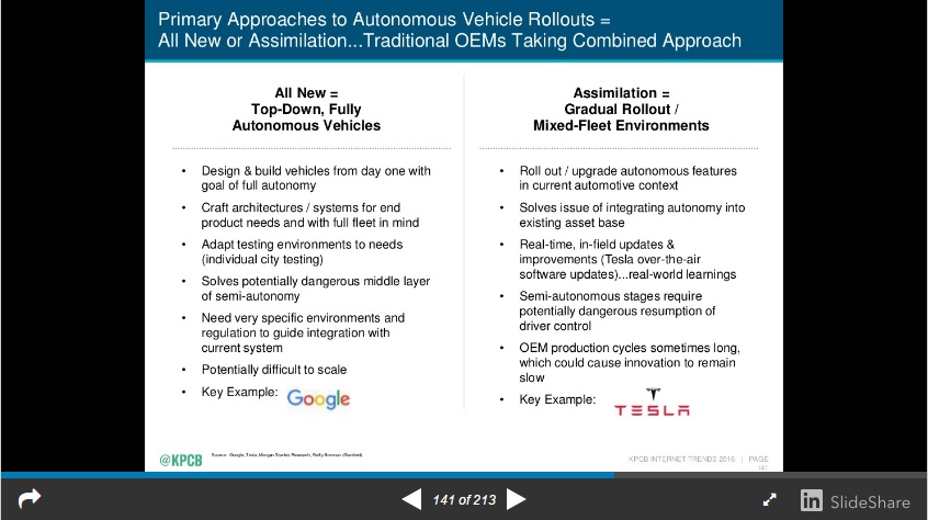That’s why Meeker’s set of slides about the state of the U.S. auto industry – heavily maligned for the past two decades or so – were a refreshing breath of cautious optimism. While auto leaders like GM and Ford still fight an uphill battle, U.S.-based up-and-comers on the West Coast may be signaling a new path to auto prominence. American companies like Uber, Lyft, and Tesla are all part of a hi-tech revolution in the auto industry. Complex computing is now required for every trip we take in our cars, and these companies are on the cutting edge of that technology. In the slide below, she shows the different approaches Tesla and Google are taking in the race for fully autonomous vehicles:
