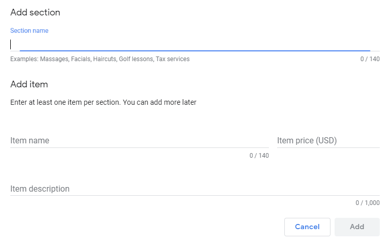 The services section of GMB allows businesses to create custom service categories and add detailed descriptions along with prices.