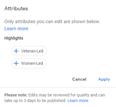Additional Categories: Be sure to include all categories that accurately represent your business. Note that categories are frequently updated, so check back regularly to see if any additional categories are applicable.